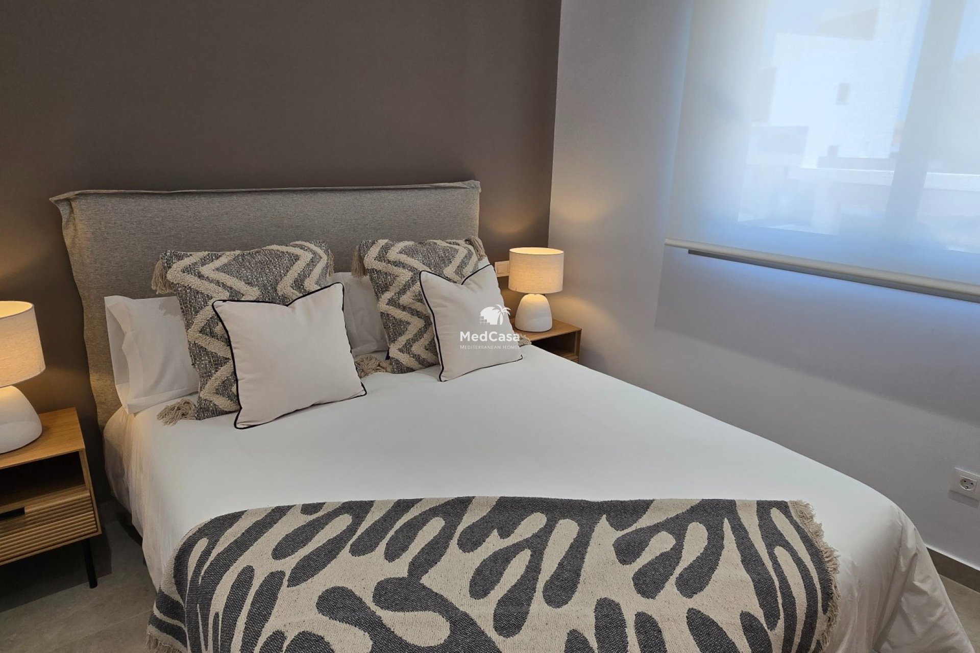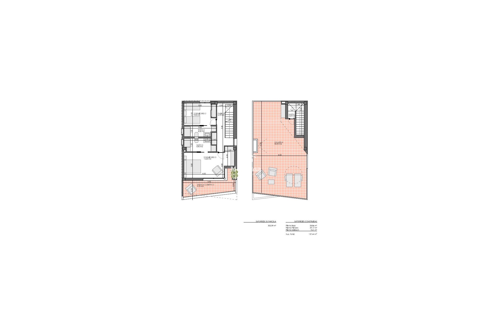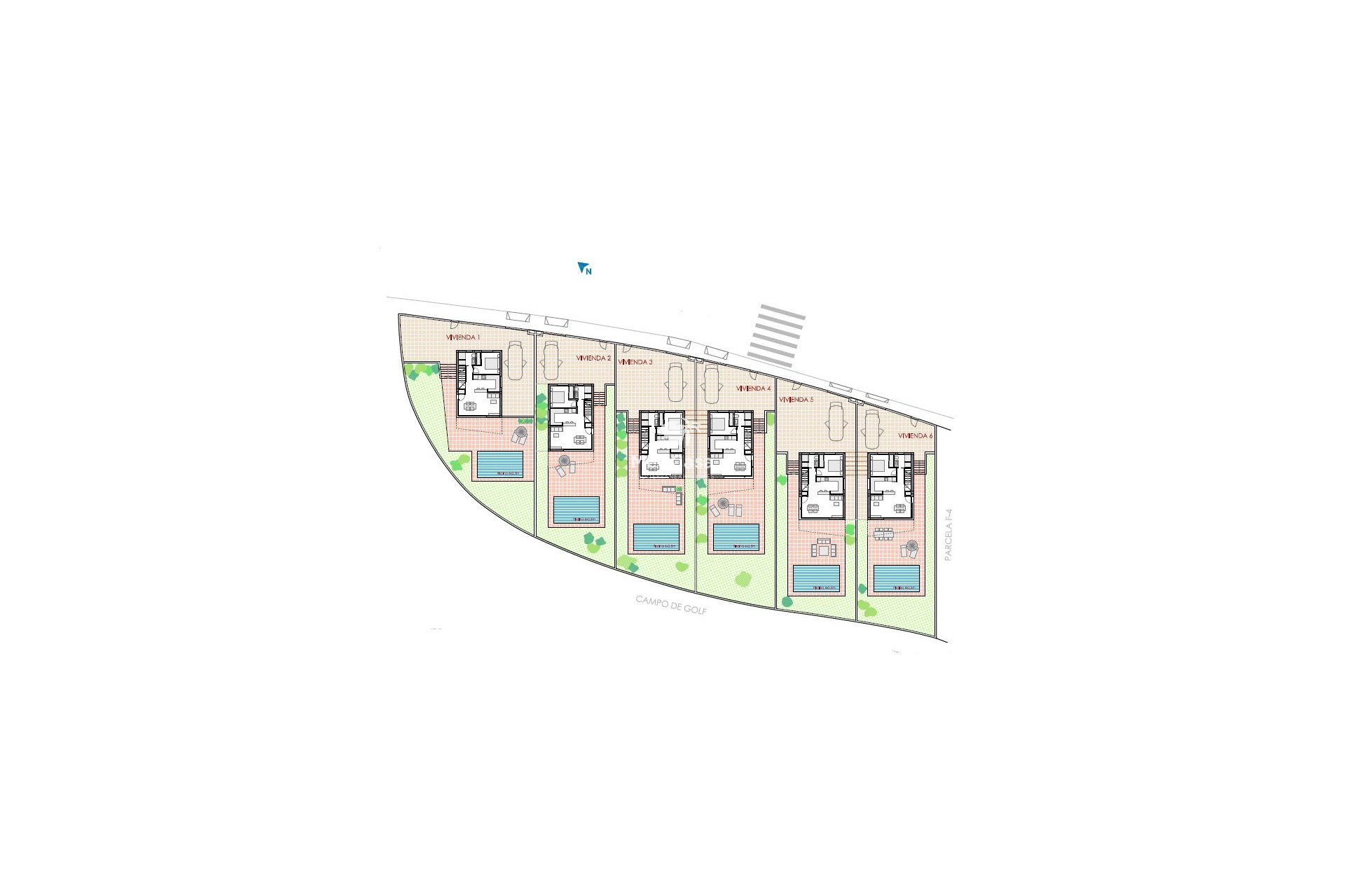 These modern villas, only 6 in total, are located directly in a golf course with views of the golf course and a private pool. They have a total built area of approximately 127 m², with 3 bedrooms, 3 bathrooms (2 en suite), a living/dining area with a modern fitted kitchen, and a rooftop terrace of approximately 54 m².