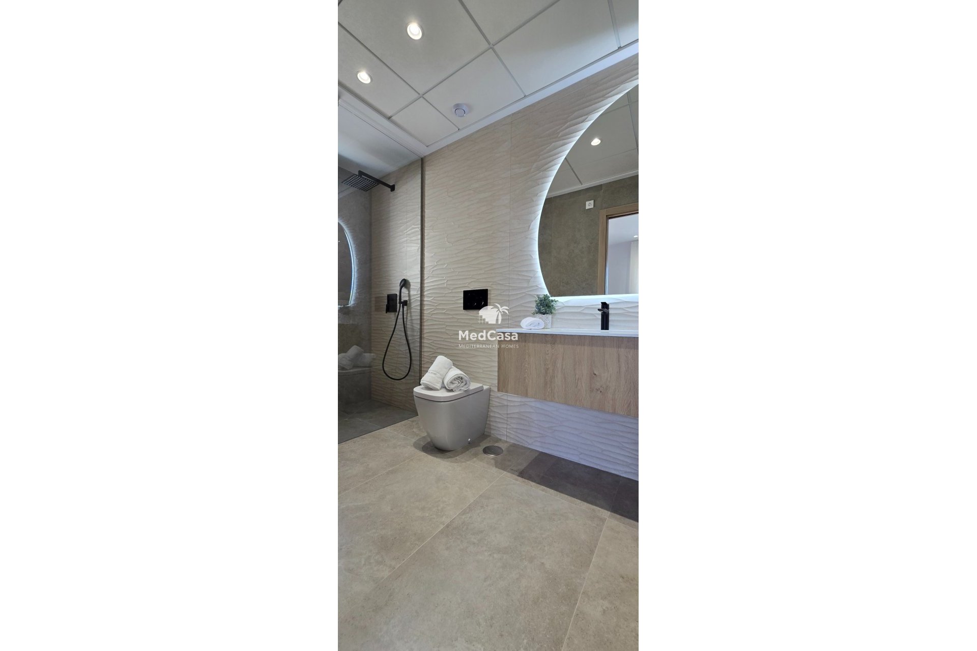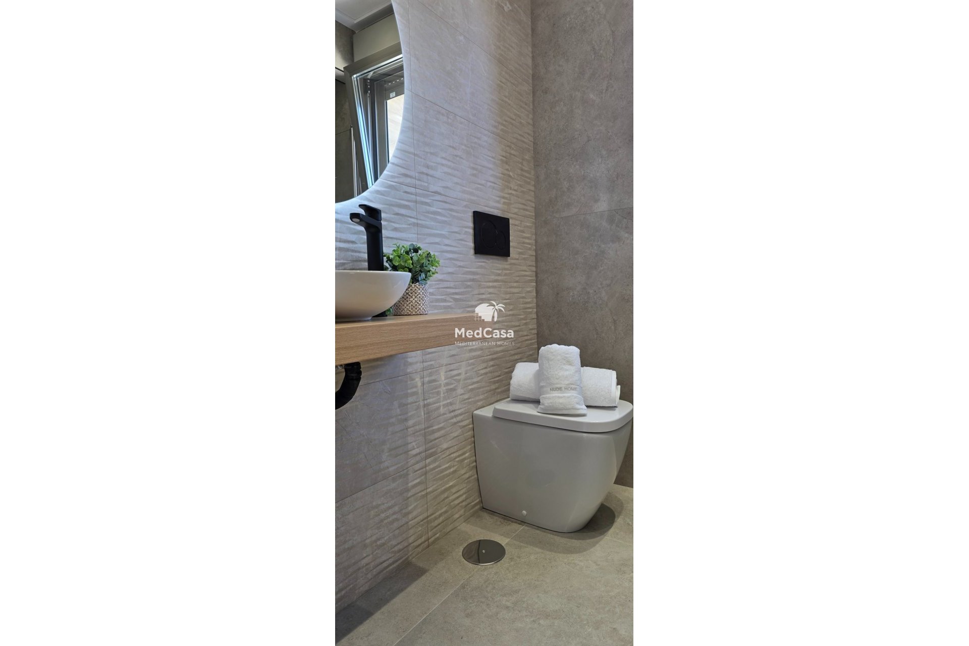 The equipment of these new-build villas includes, among other things, aluminum windows with double glazing, optimal sound and thermal insulation according to current EU building guidelines, security doors at the entrance, pre-installation of air conditioning, electric shutters, bathrooms with mirrors and glass shower screens, built-in wardrobes in the bedrooms, and a modern fitted kitchen with appliances.
