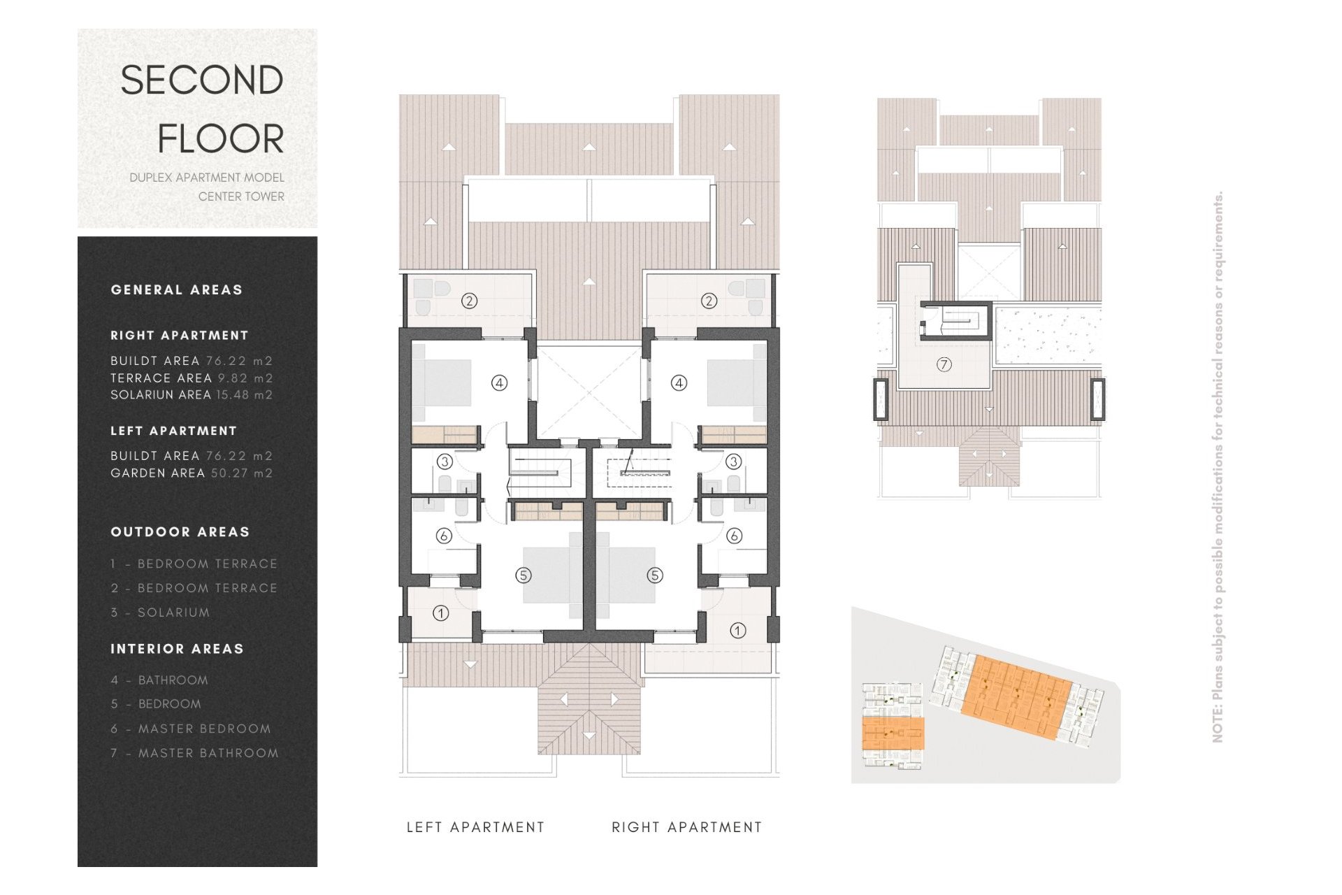 These eight apartment blocks offer an exclusive and high-quality residential environment, with each building consisting of only four homes, ensuring privacy and tranquility for its residents. On the first and second floors, there are duplexes, each with 3 bedrooms and 3 bathrooms, some of which include a solarium ranging from 15.48-21.99 m², ideal for enjoying the climate and views of the area.