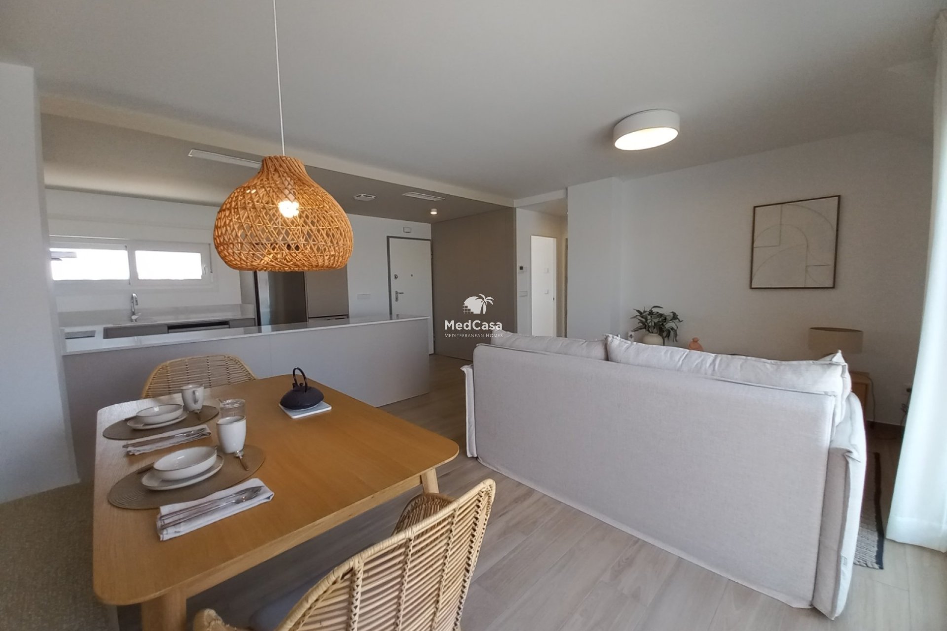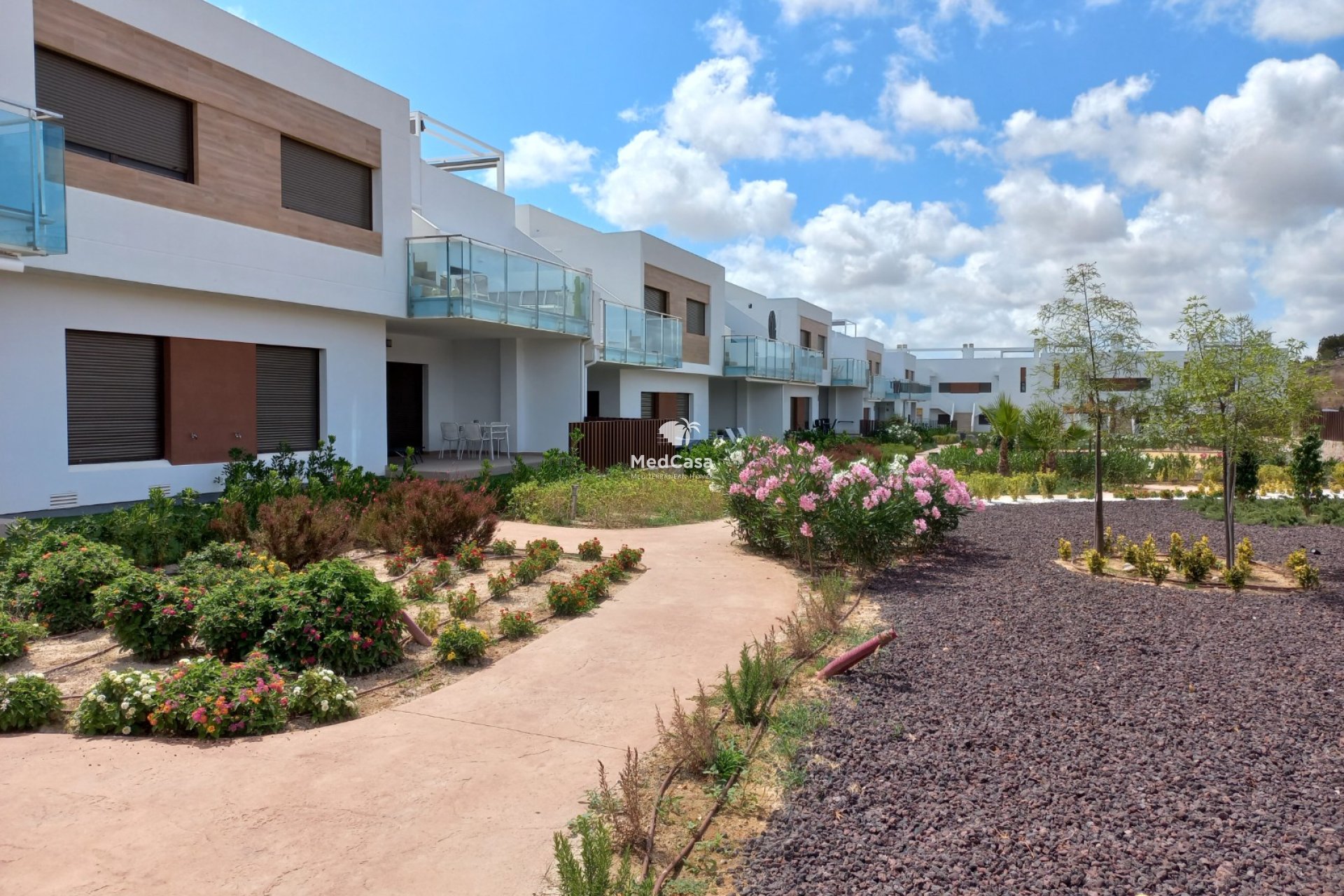 Great apartment complex between mountains and with a fantastic pool area. This modern flat (bungalow) complex with community area and pool near Los Monesinos, has a total constructed area of approx. 190 m2 including terraces + garden, with 3 bedrooms, 2 bathrooms (1 of them en-suite), living/dining area and with modern fitted kitchen.