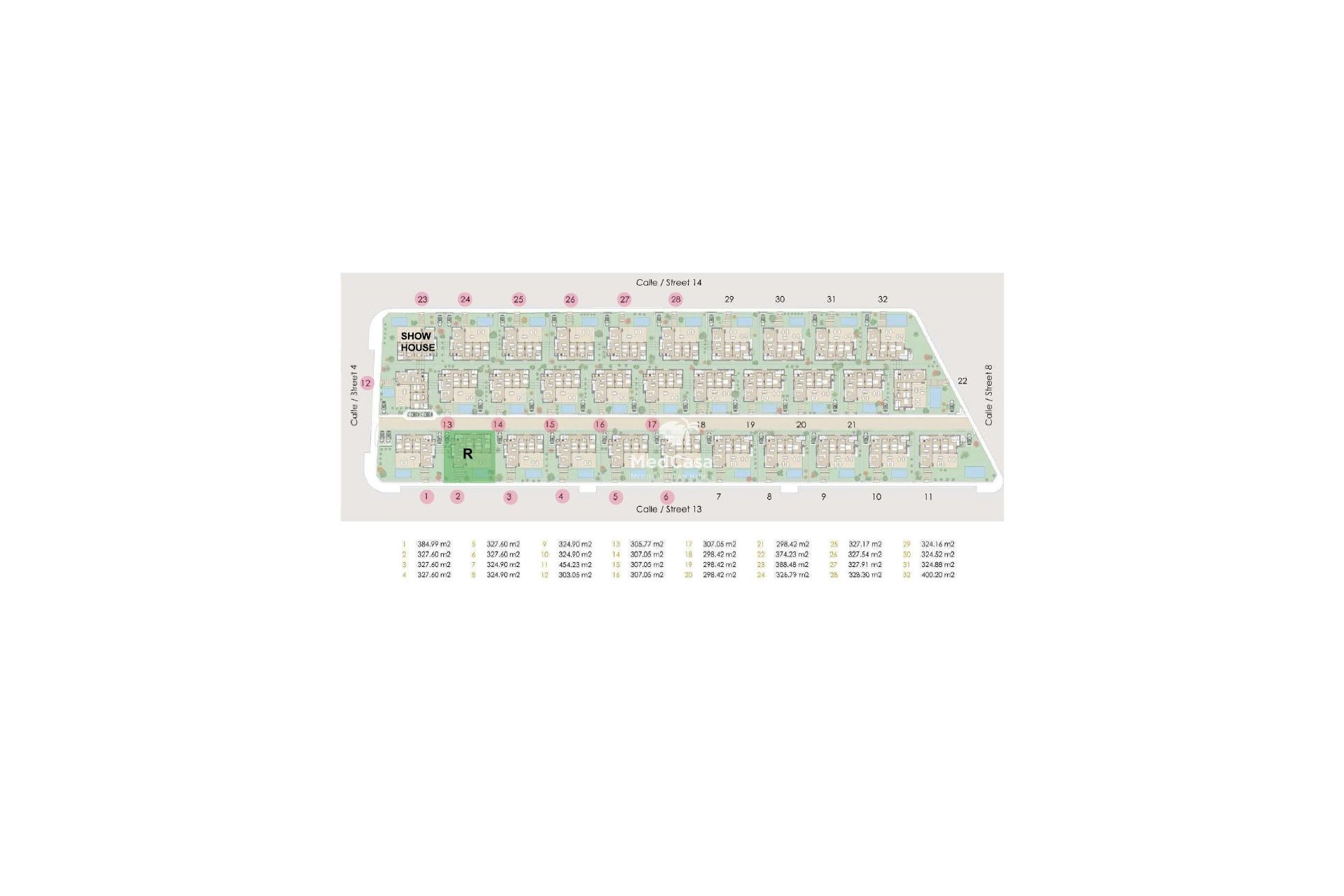 Modern villas with private 5x3 m swimming pool in a private residential complex, featuring a total built area of approx. 235 m² with 4 bedrooms, 2 bathrooms (2 of them en-suite), walk-in closet, utility room, living/dining area with modern fitted kitchen, approx. 60 m² of terraces, and private plots ranging from 303–327 m².
