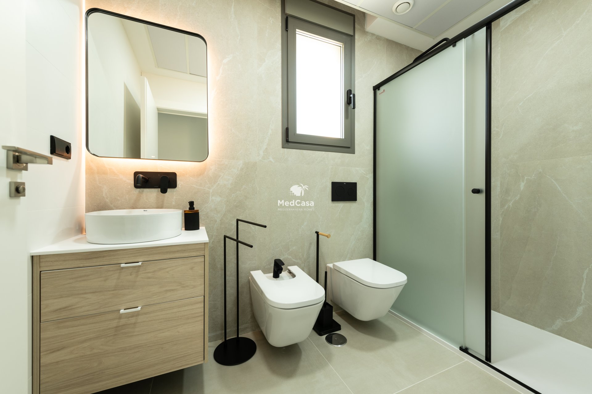 The equipment of these properties includes, among other things, aluminum windows with double glazing, optimal sound and heat insulation in accordance with current EU building guidelines, security doors in the entrance area, video intercom system, electric entrance gate, pre-installation of air conditioning, electric roller shutters, bathrooms with mirrors and glass shower enclosures, LED lighting, built-in wardrobes the bedrooms and a modern fitted kitchen with electrical appliances,... and much more.
