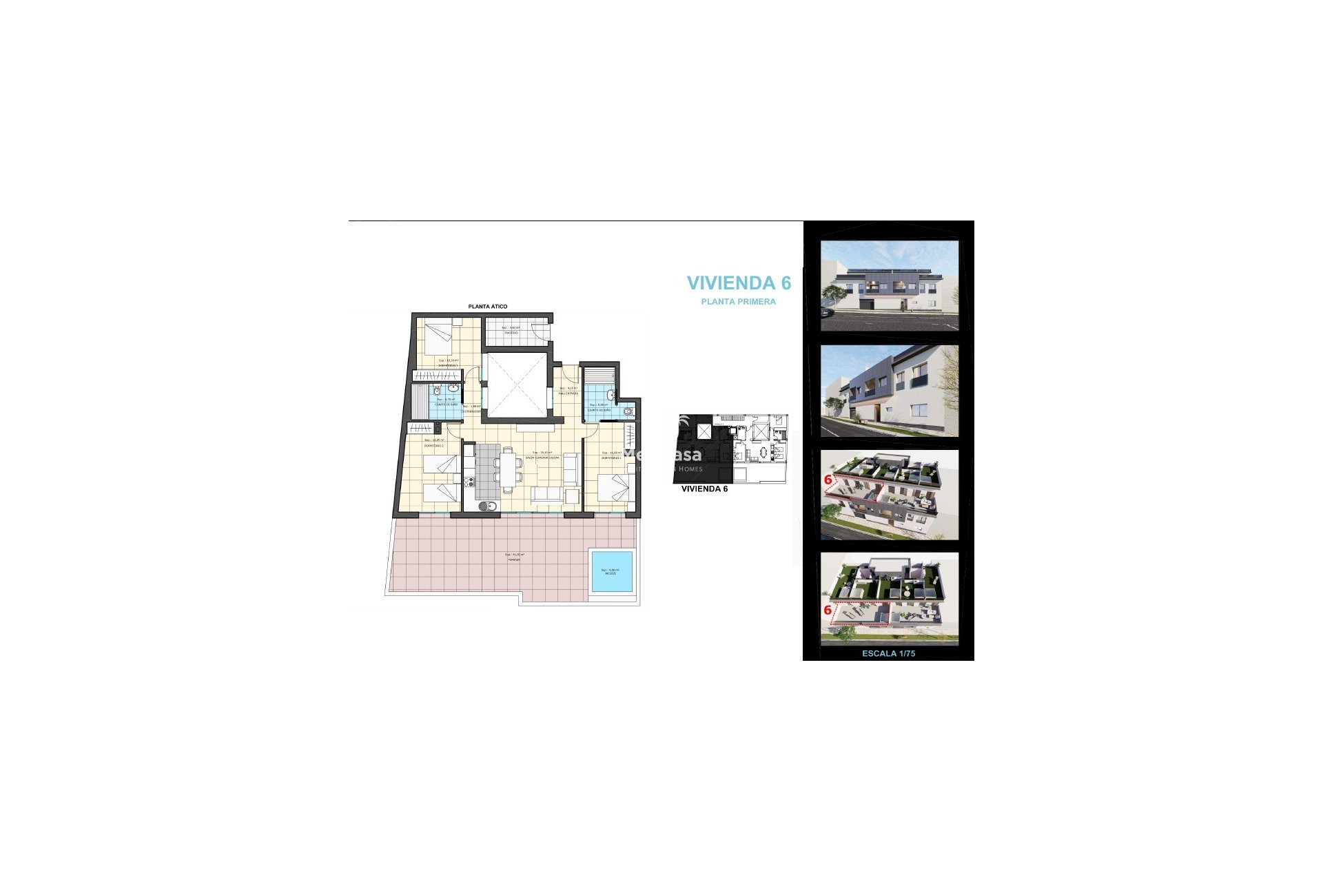 Los apartamentos de la primera planta tienen 1 o 2 dormitorios, 1 o 2 baños, un trastero (solo en los de 1 dormitorio), salón-comedor con cocina moderna y una terraza en la azotea de entre 19 y 34 m² con jacuzzi y cocina de verano.