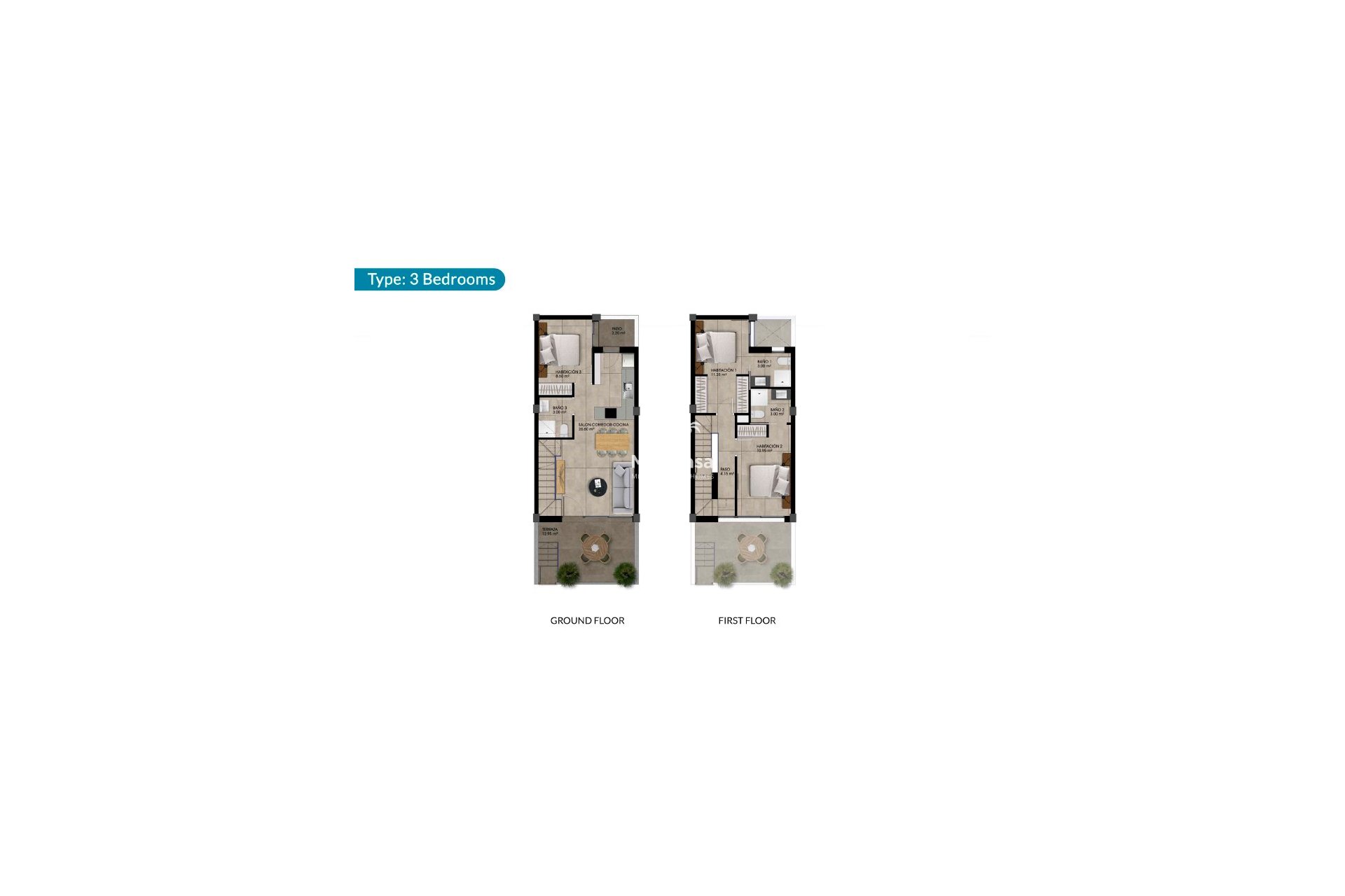 La versión de 3 dormitorios tiene en la planta baja el salón-comedor, la cocina, un baño y un dormitorio. En la planta superior se encuentran 2 dormitorios, 2 baños (2 en suite) y un solárium de unos 30 m2 con barbacoa*.