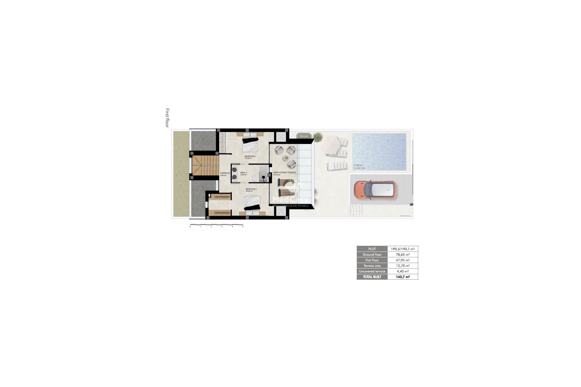 Modernas casas adosadas en un pequeño complejo privado con piscina, tiene una superficie total construida de 144 m2 con 3 dormitorios, 2 baños+ aseo, vestidor, salón/comedor. zona con cocina moderna equipada, terraza de aproximadamente 41 m2 m2 así como una parcela de unos 190m2.