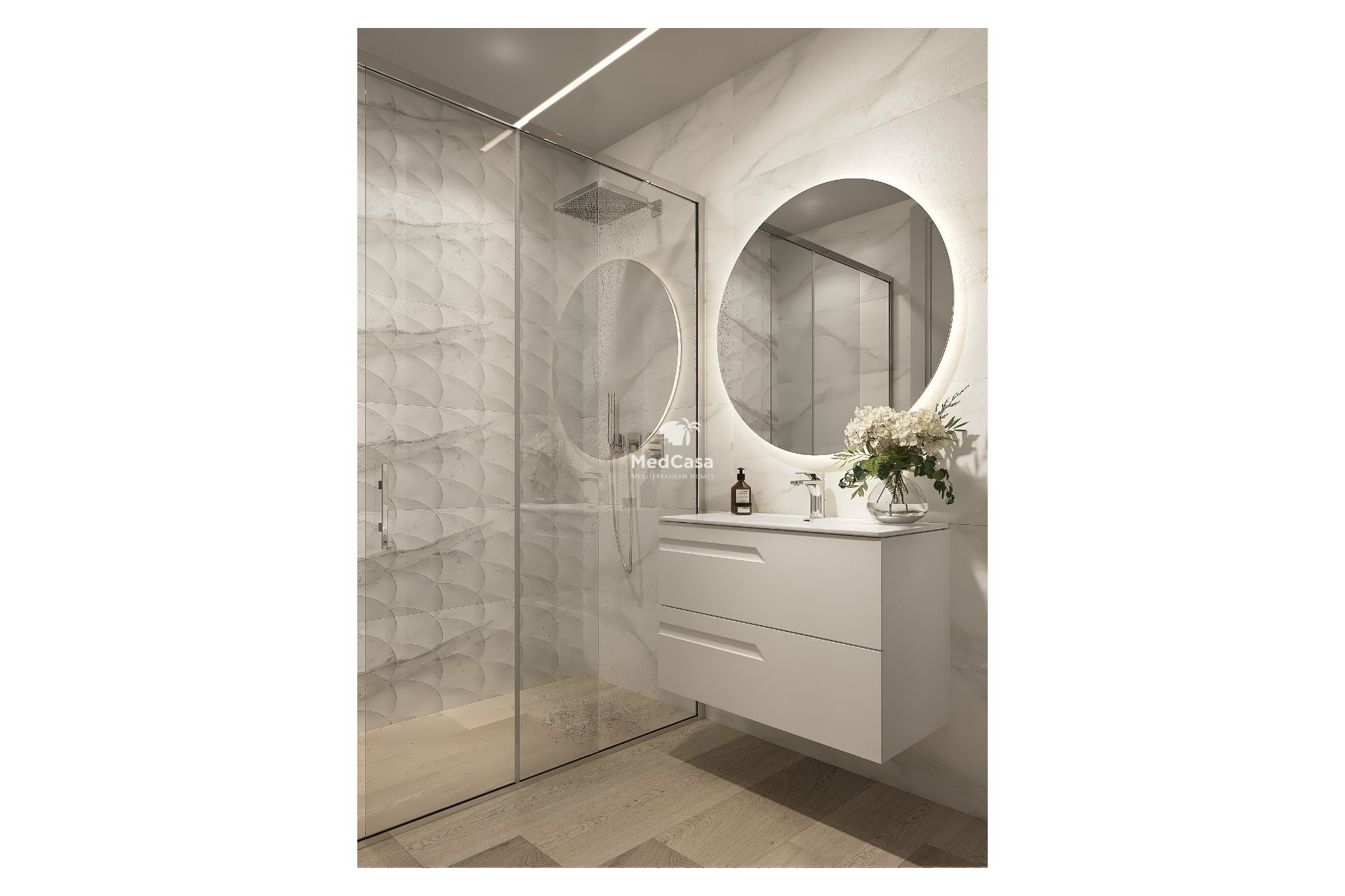Los cuartos de baño cuentan con suelo radiante y están diseñados con amplios platos de ducha con mampara, lo que proporciona un ambiente moderno y cómodo. Además, los sanitarios son suspendidos con cisterna empotrada, ofreciendo un diseño minimalista y práctico. El apartamento también cuenta con aire acondicionado por conductos, garantizando una temperatura agradable en todas las estancias durante todo el año.