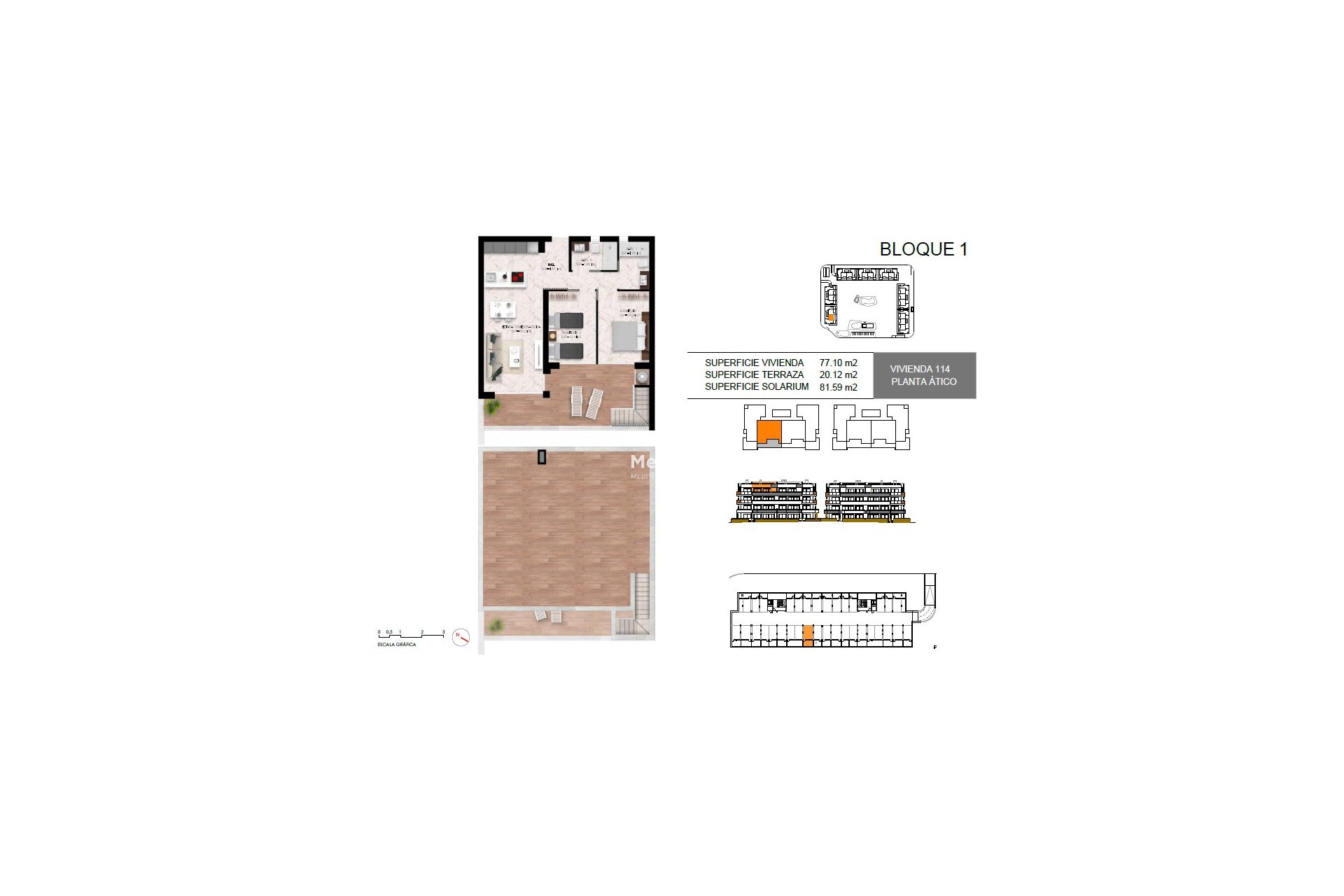 Las viviendas en planta baja disponen de amplias terrazas embaldosadas de entre 48 y 72 m², mientras que los áticos cuentan con soláriums privados de entre 67 y 81 m².