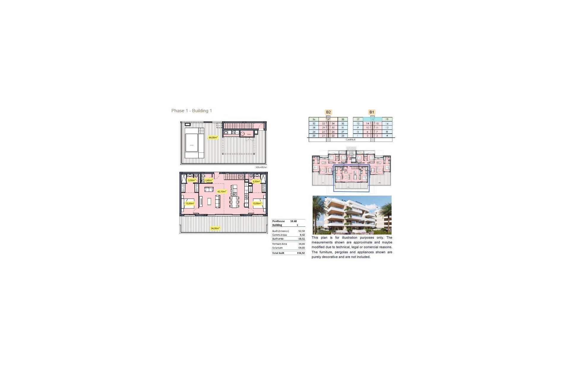 Los tres áticos tienen 2 o 3 dormitorios, 2 baños, una superficie construida de aproximadamente 220 m², salón/comedor con cocina moderna, terraza de unos 34-47 m² y un enorme solárium de aproximadamente 64-75 m².