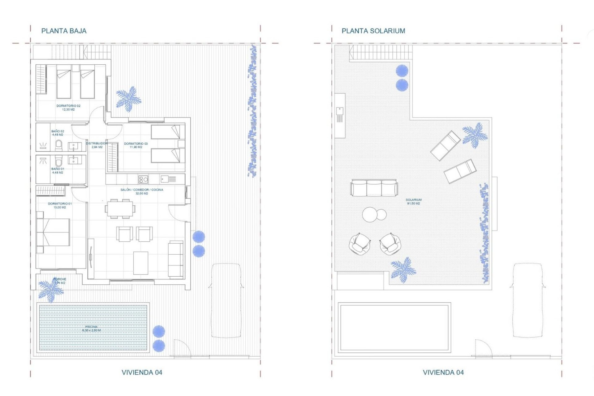 Cada vivienda dispone de su propia plaza de aparcamiento en la parcela, una piscina privada con ducha y un solarium con cocina exterior.