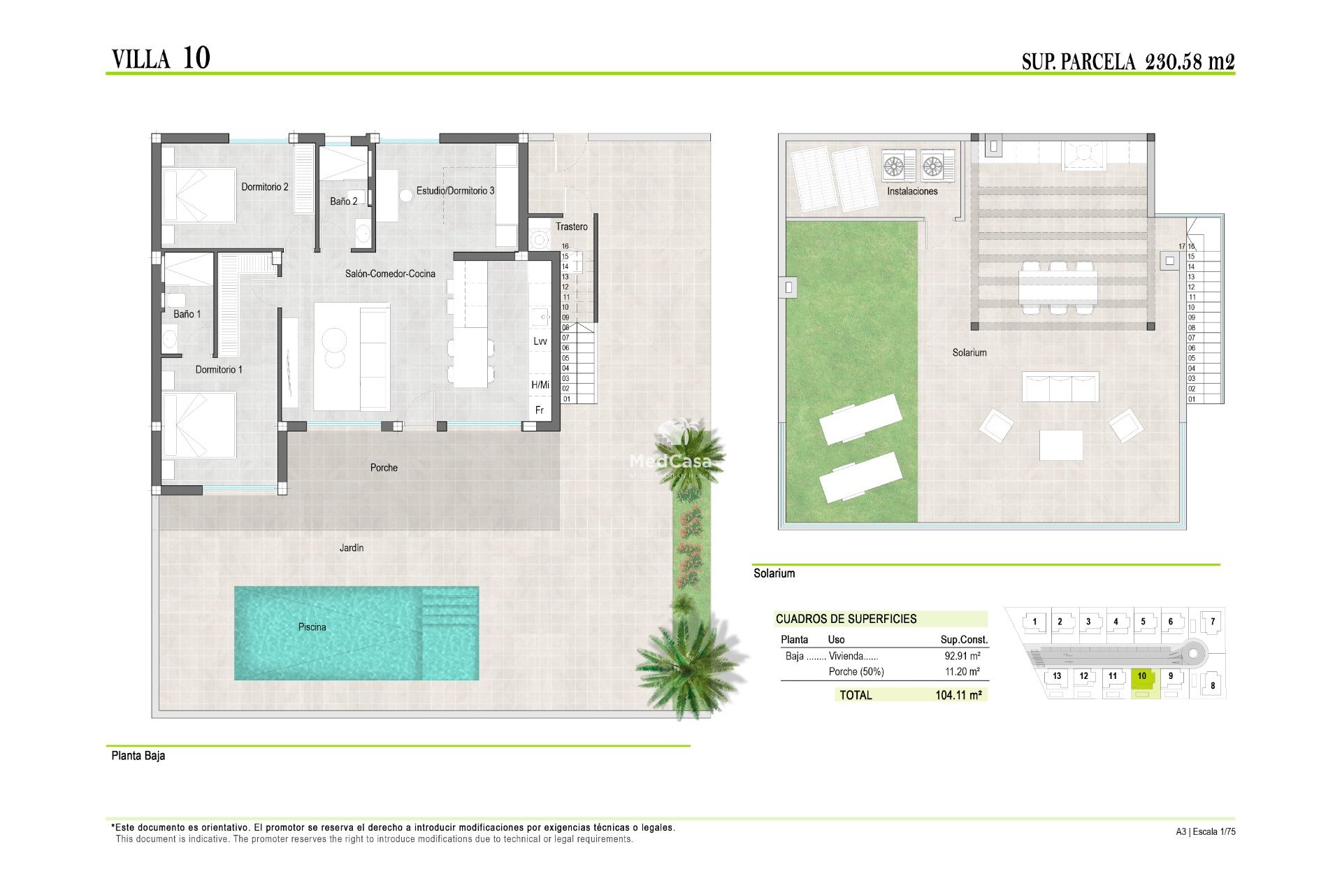 Estas modernas viviendas unifamiliares con piscina privada y ducha solar se encuentran en una urbanización exclusiva, cerrada y vigilada. Cuentan con una superficie construida total de entre aproximadamente 75,50 y 138,14 m², con 2, 3 o 4 dormitorios, 2-3 baños (1 de ellos en suite), salón/comedor con cocina moderna integrada y un terreno de entre aproximadamente 217,38 y 306,21 m².