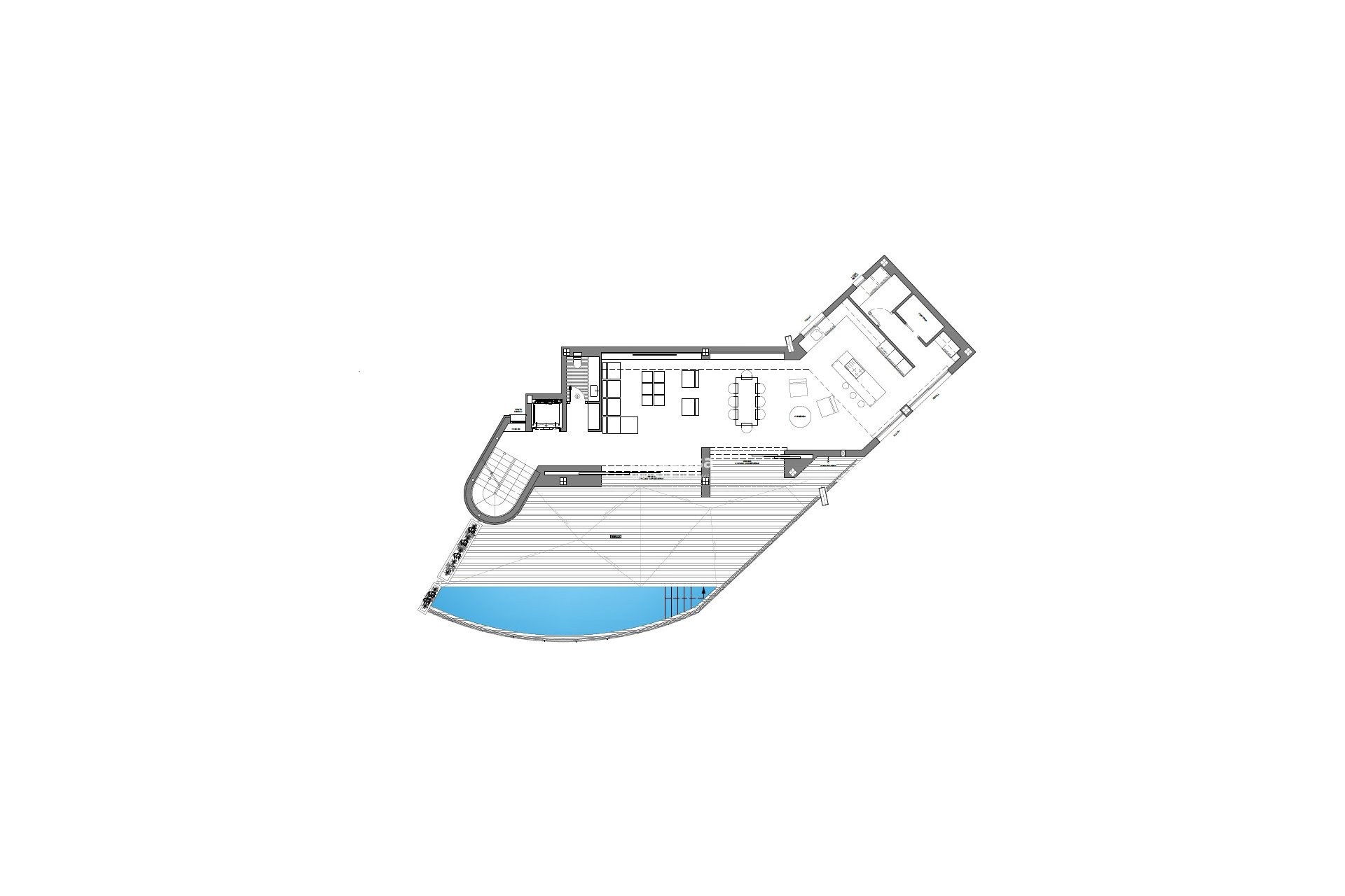 La planta principal dispone de un gran salón comedor abierto que se conecta directamente con una amplia cocina equipada con una isla central y una barra de desayuno, creando un espacio multifuncional que fomenta la interacción y el disfrute en familia o con invitados. Desde aquí, se accede a la terraza y a la piscina privada, un lugar ideal para el relax y el ocio al aire libre en un entorno tranquilo y privilegiado.