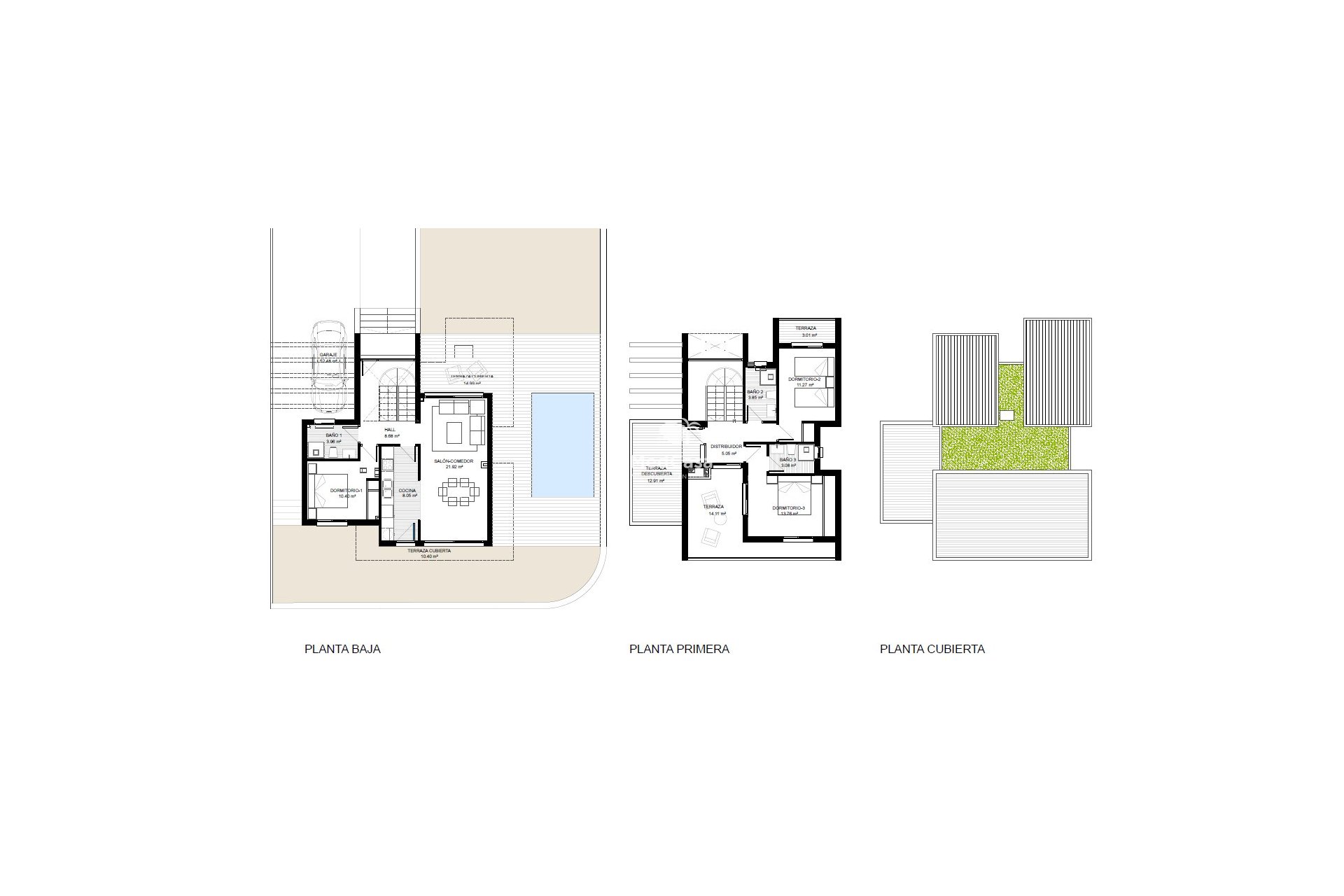 Diese wunderschöne private Anlage von nur 7 Villen mit privatem Swimming-Pool (6x3 oder 5x4 m), verfügen über eine konstruierte Fläche von ca. 125,25 m2 mit 3 Schlafzimmern (eins von den drei Schlafzimmern befindet sich im Erdgeschoss), 3 Badezimmern (1 en Suite), Wohn-/Esszimmer mit moderner Einbauküche und vielen Terrassen.