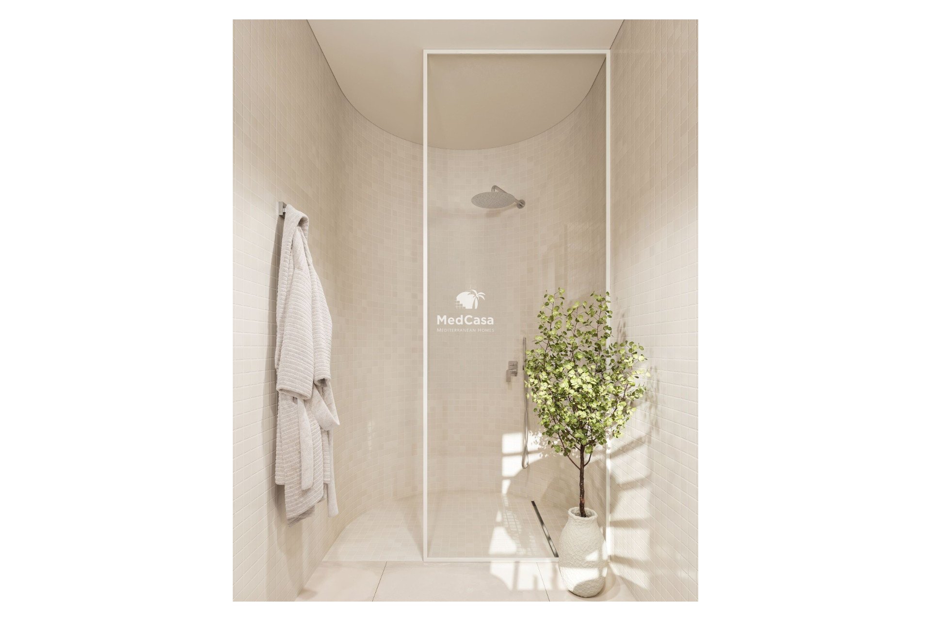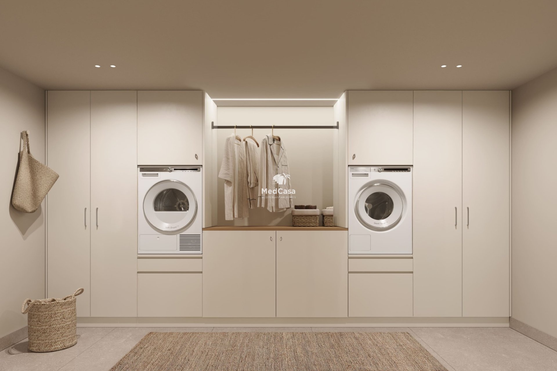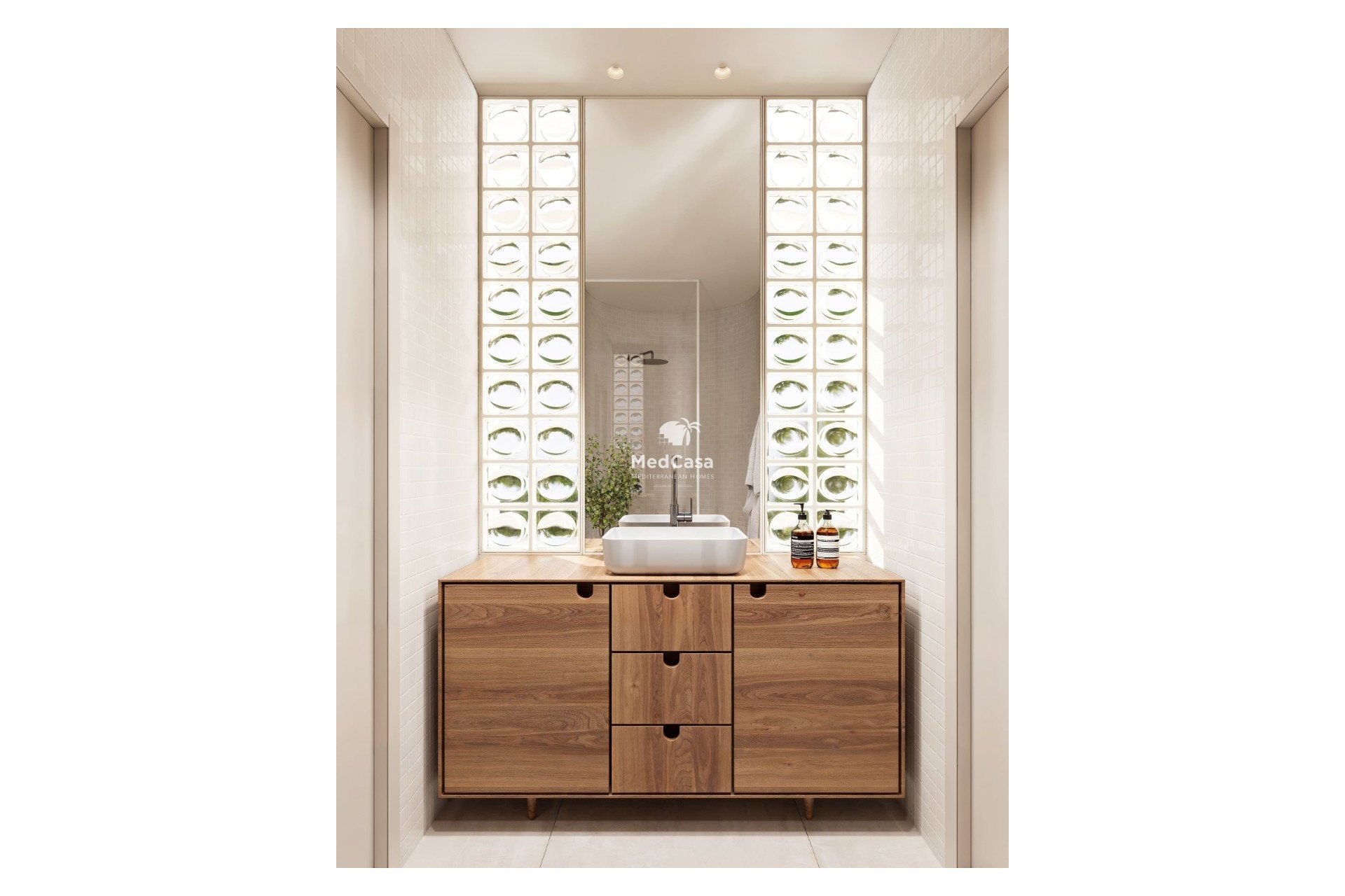 Die Villa verfügt über vier Schlafzimmer mit Einbauschränken, drei voll ausgestattete Badezimmer und ein Gäste-WC, alle in einem modernen und eleganten Stil gestaltet. Die Badezimmer sind mit bodengleichen Duschen mit Glasabtrennung, Waschbeckenunterschränken mit Spiegel sowie Fußbodenheizung ausgestattet und bieten ganzjährigen Komfort.