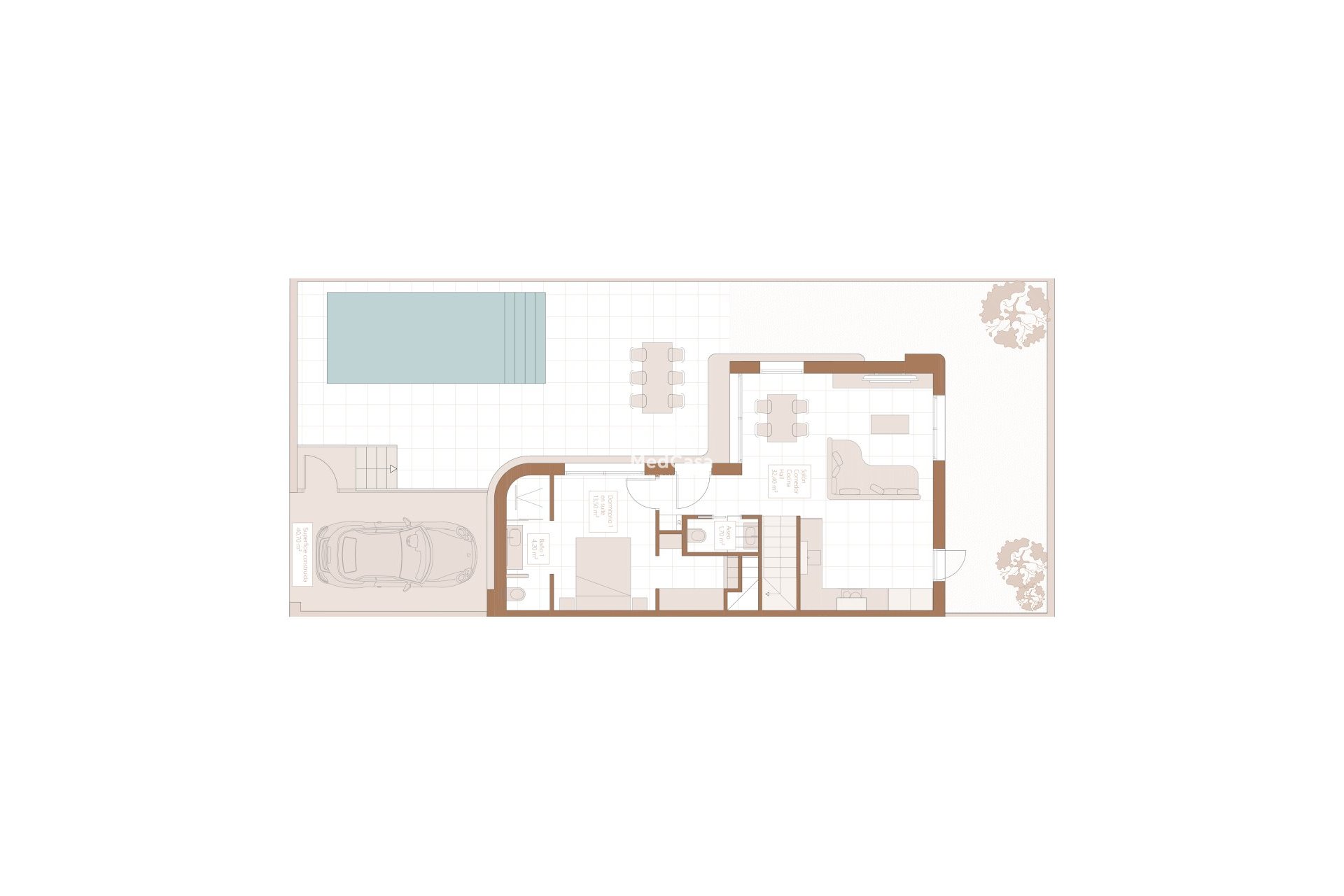 Die moderne Küche ist vollständig mit Möbeln aus nachhaltigem Holz und langlebigen Oberflächen ausgestattet. Sie verfügt über eine Edelstahlspüle und Armaturen sowie eine Arbeitsplatte aus Silestone oder einem ähnlichen Material, die modernes Design und Funktionalität vereint. Ergänzend dazu ist eine integrierte Dunstabzugshaube von Mepamsa oder ähnlich im Lieferumfang enthalten, die sich harmonisch in das Gesamtdesign der Küche einfügt. (Weitere Elektrogeräte sind nicht enthalten.)