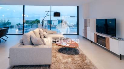 Zur hochwertigen Ausstattung dieser Villen gehören unter anderem Aluminiumfenster mit Doppelverglasung, optimale Schall- und Wärmeisolation nach aktuellen EU-Baurichtlinien, Sicherheitstüren im Eingangsbereich, Klimaanlage, elektrische Rollläden, Smat Home, LED-Beleuchtung, Badezimmer mit Glasduschwänden und Spiegeln, Einbauschränke in Schlafzimmern und eine Einbauküche mit Elektrogeräten von BOSCH sowie ein Aero-Therm-System für die Heißwasserversorgung.
